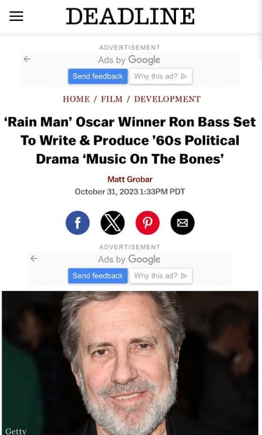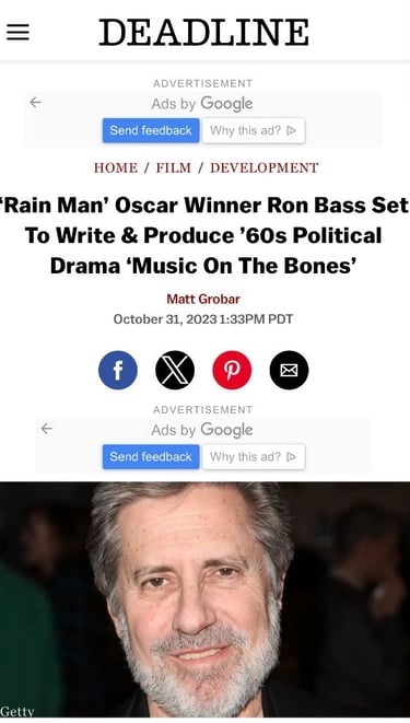 Great news!!! Oscar winner Ron Bass to write the screenplay adaptation of Music on the Bones! (Renegade Press) Ron Bass has written over $2 Billion total (Box Office films) in his over 40 year career! He is arguably a Top 10 Screenwriter of all-time! ("Rain Man", "My Best Friend's Wedding", "Waiting to Exhale", "Sleeping with the Enemy", "Gardens of Stone", "How Stella Got Her Groove Back", "The Joy Luck Club", "What Dreams May Come" etc etc etc) Renegade Press is so stoked about this upcoming film project! Congrats to authors Avi Bar Lev & Jody Marriott Bar-Lev and thank you for allowing Renegade Press to publish your amazing and well-written book! Thanks to Deadline Hollywood for the great article and shoutout! Wow!!!!!!!